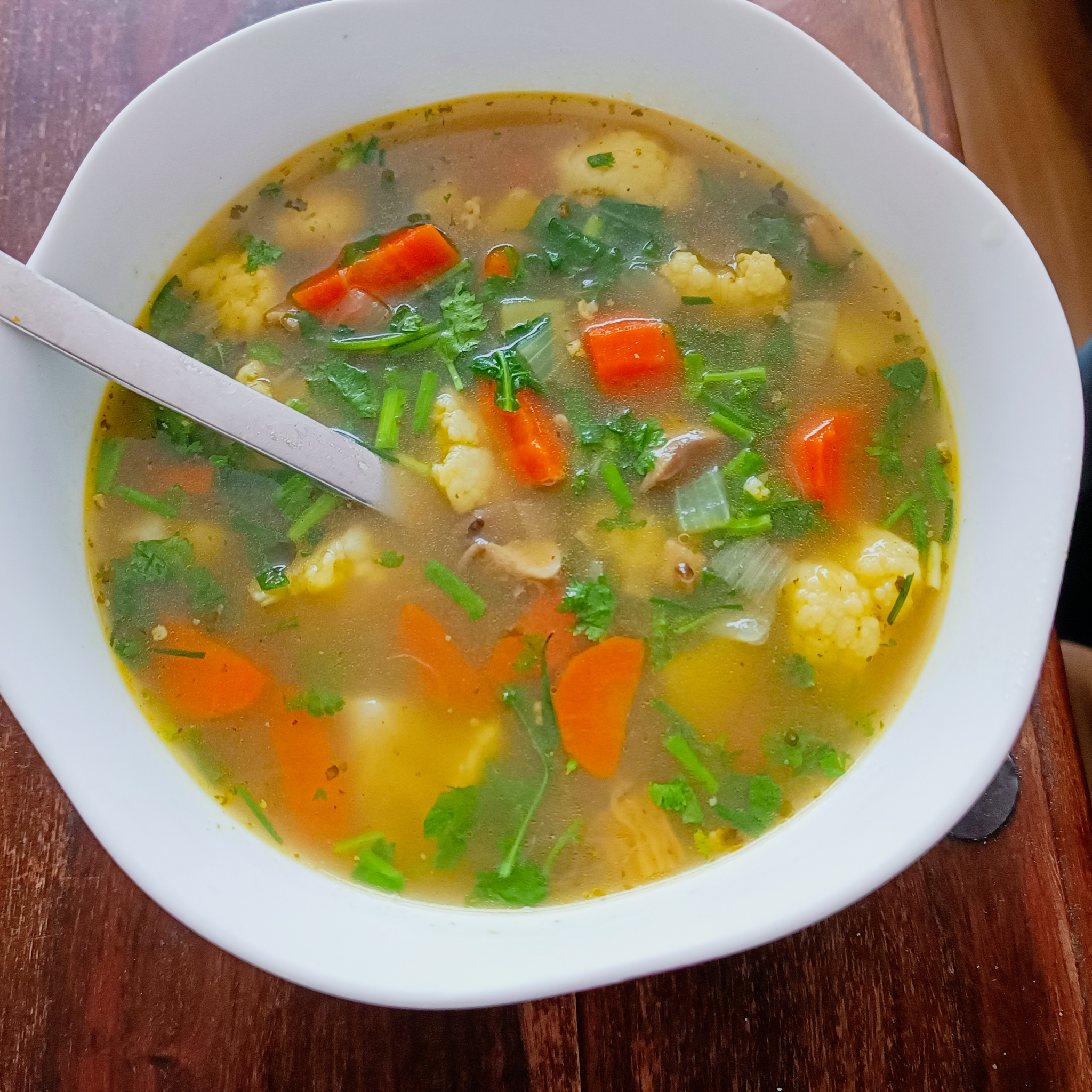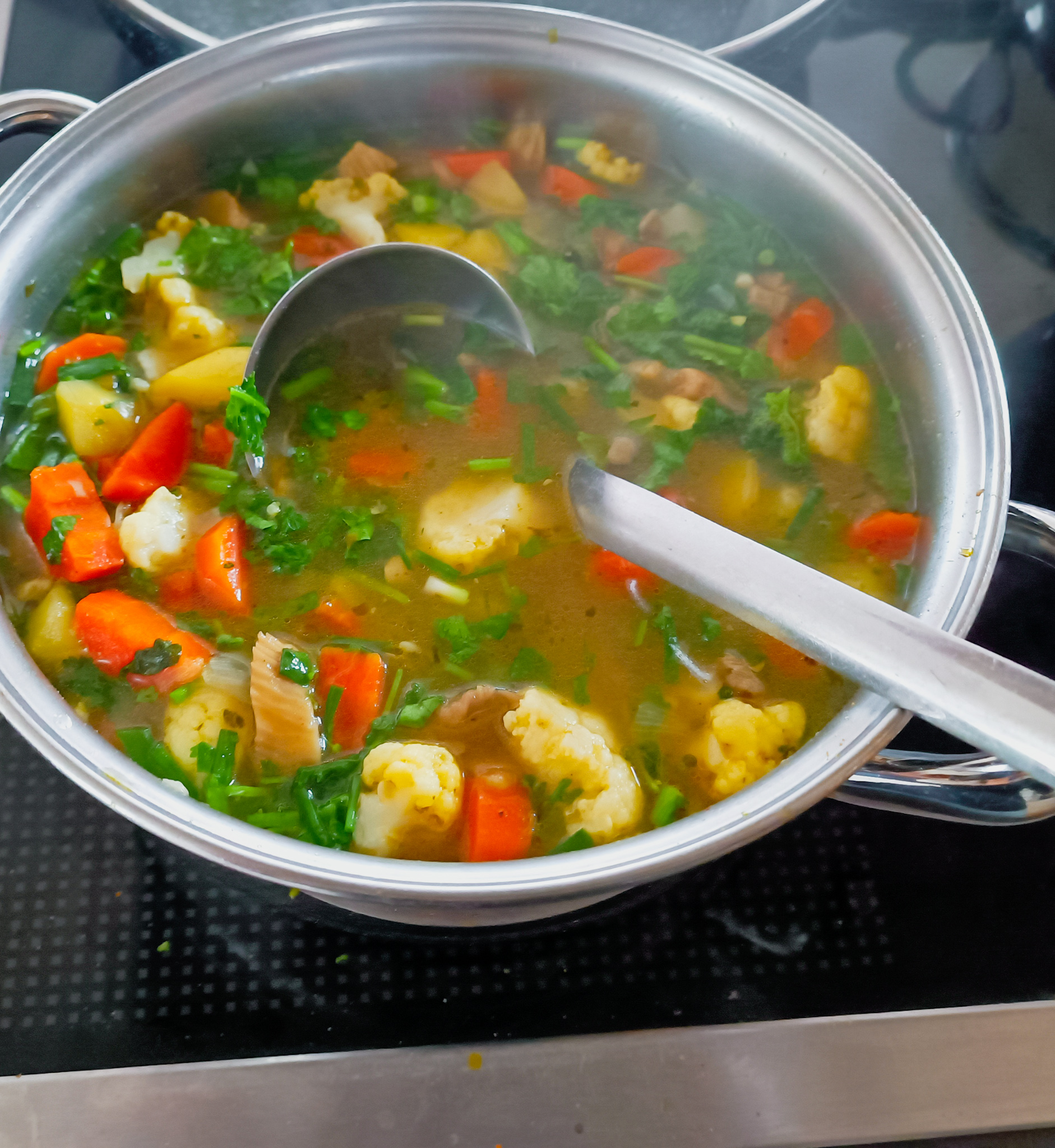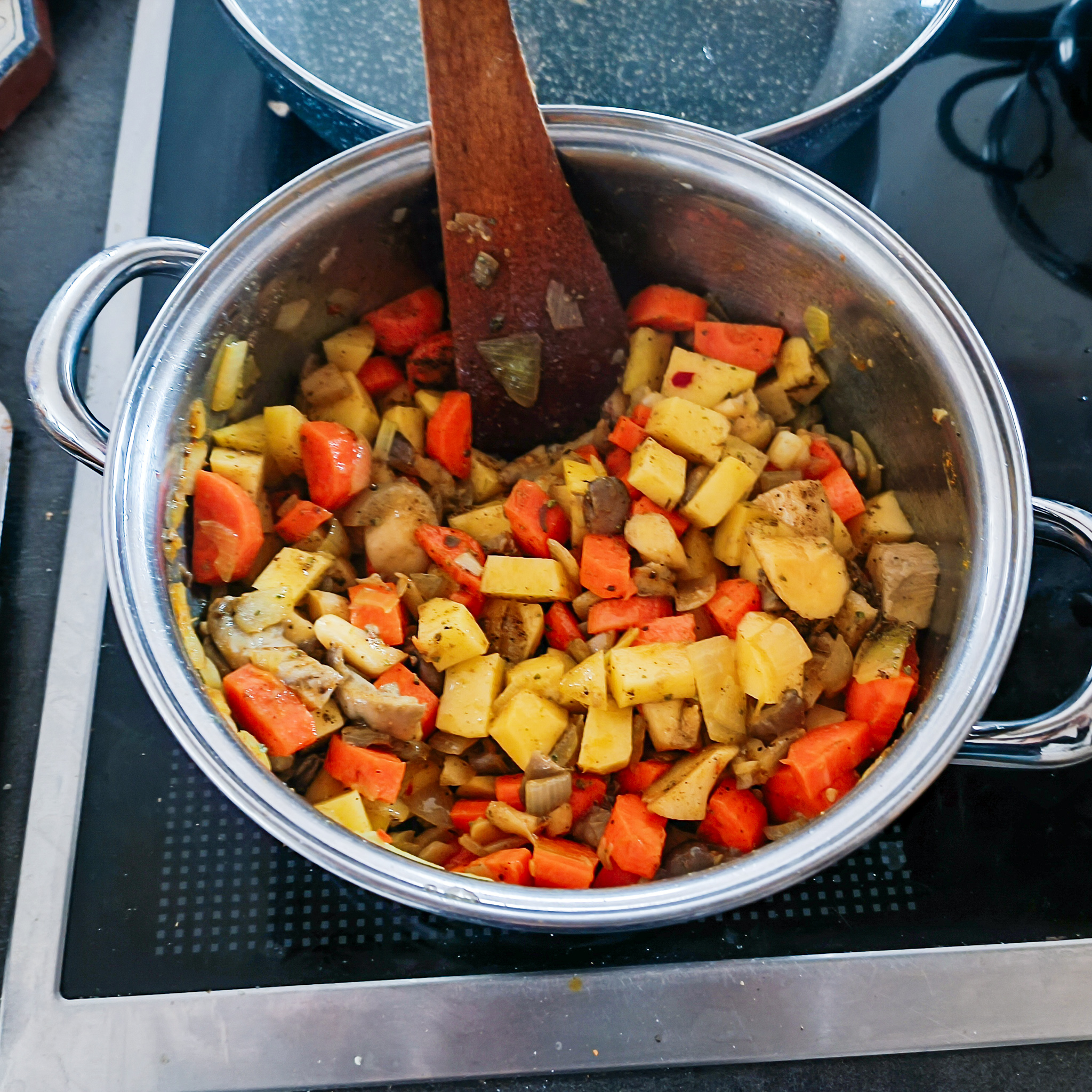 Nakrájenou cibuli a česnek osmahněte na oleji nebo ghí a přidejte na plátky nakrájenou hlívu. Smažte 5 minut a přidejte všechno koření. Prosmažte další minutu a pak zalijte vodou a přidejte brambory, zeleninu, bobkový list a majoránku. Vše kromě květáku, pokud jste se jej rozhodli použít. Vařte 20 minut a přidejte květák. Povařte dalších 5 minut a přidejte na větší kousky nakrájenou bršlici – zhruba na půlcentimetrové proužky. Nechte minutu povařit a dochuťte solí a pepřem. Můžete servírovat. Dobrou chuť. Napište mi, jak vám bršlice chutnala.