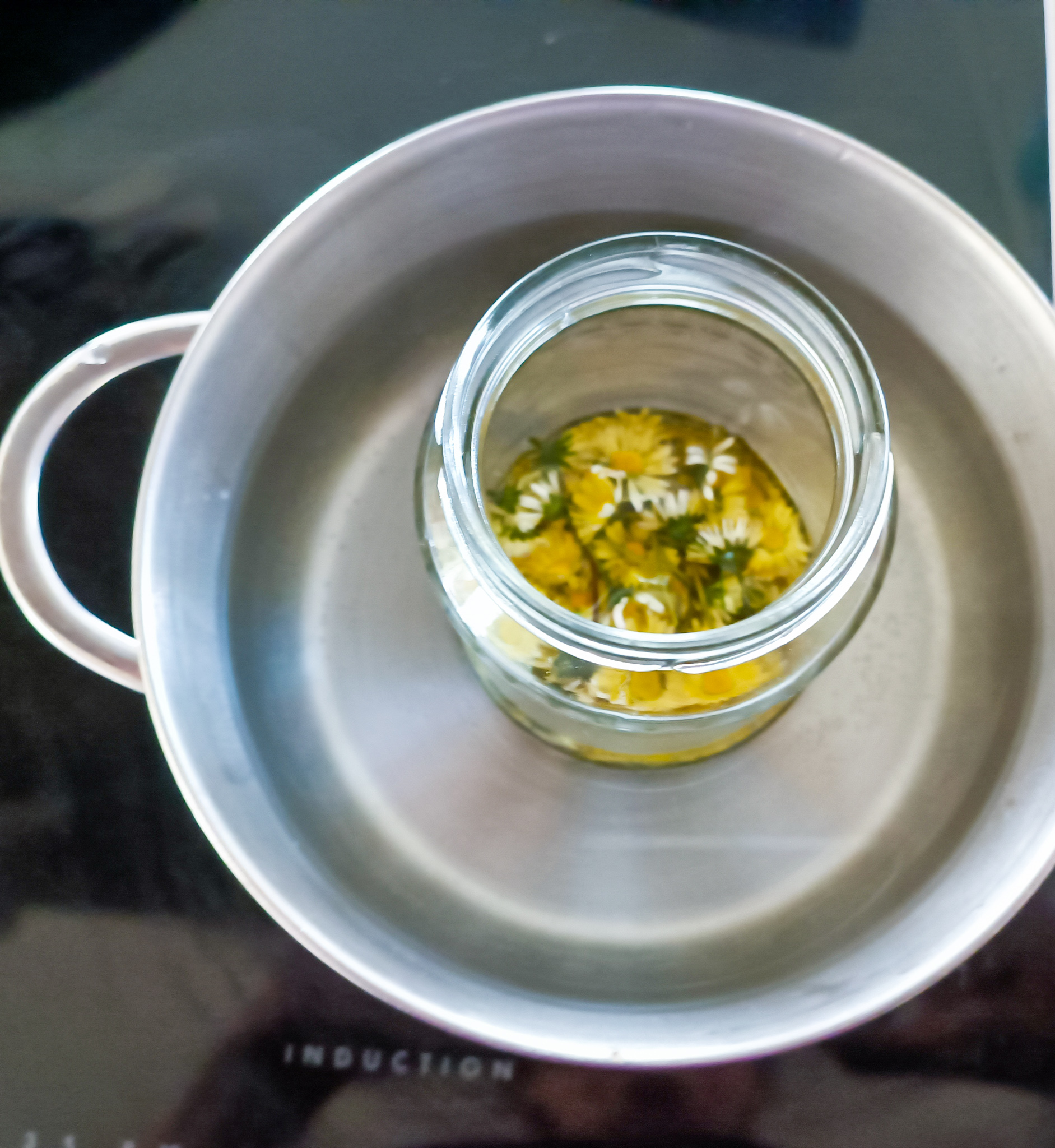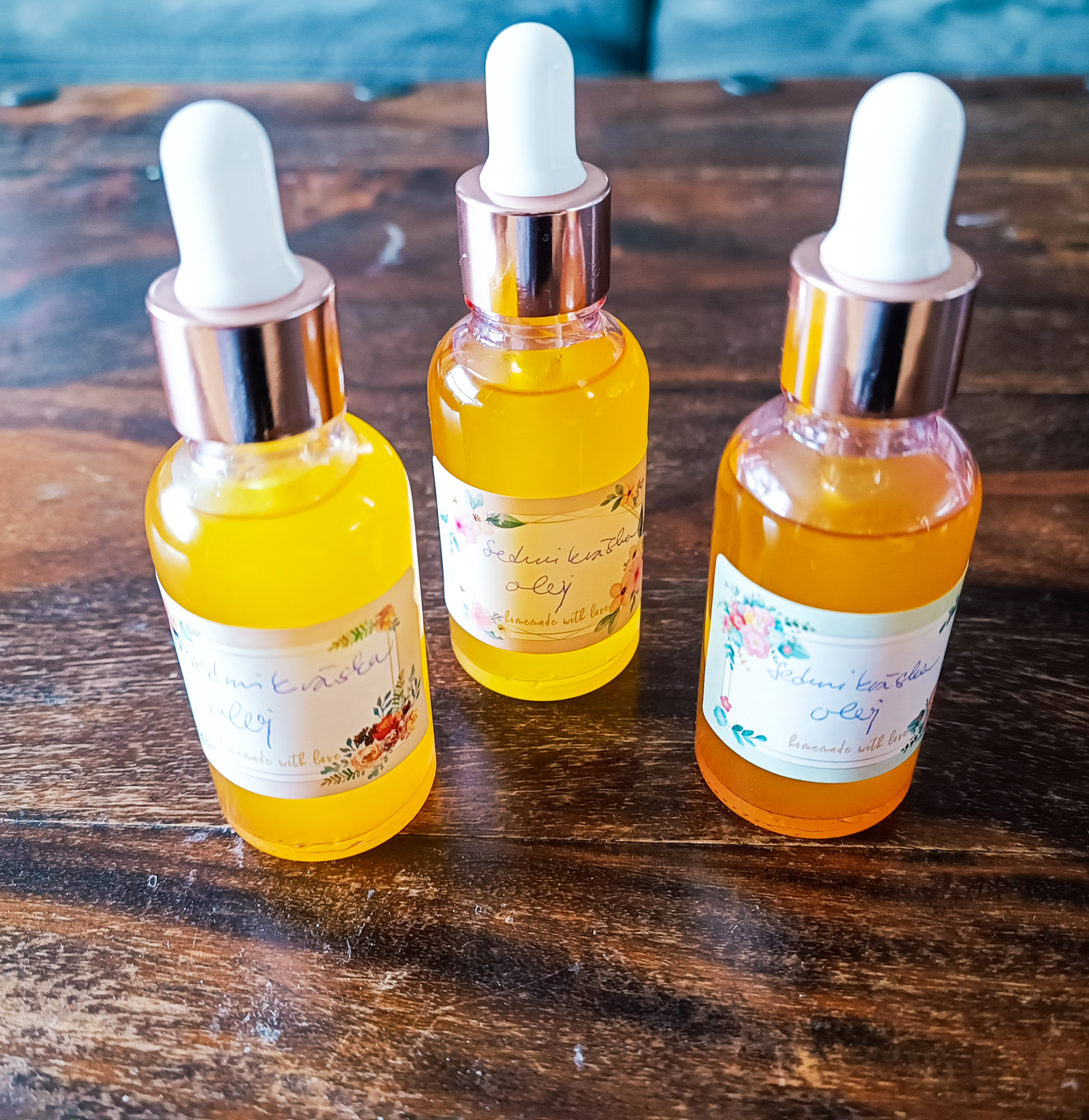 - A nyní recept pro méně trpělivé. Sklenici se sedmikráskami a olejem vložte do vodní lázně. Olej nesmí bublat. Budeme jej pouze zahřívat. Ve vodní lázni zahříváme půl hodiny na 60 stupňů. Poté necháme vychladnout, zavíčkujeme a necháme stát na slunci za oknem jeden týden. Denně protřepáváme. Přefiltrujeme, plníme do vyvařených tmavých lahviček a uchováme v chladu. Používáme na dekolt a prsa místo pleťového krému, stačí rozetřít několik kapek. Bylinné oleje na pleť jsem začala používat podle receptů od Evky Francové – kuchařky ze Svatojánu. Před léty jsem byla překvapená, jak je tento druh kosmetiky účinný. Dnes jsem nadšenou propagátorkou😊. Tak to pojďte vyzkoušet na vlastní pleti.