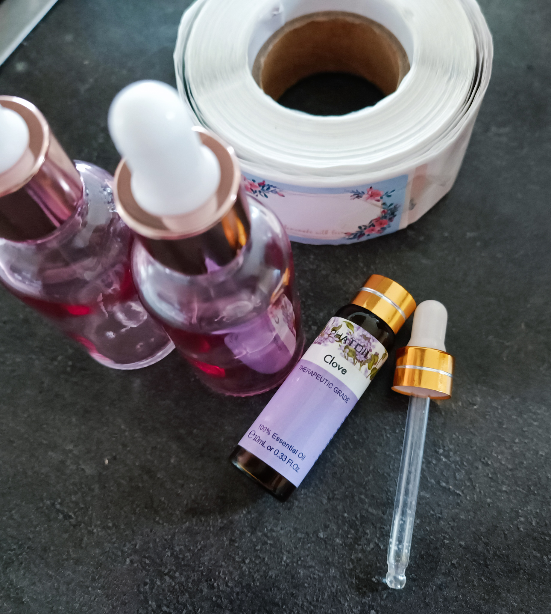 Éterický olej z červeného jetele, kadidla, geránia, pomeranče, levandule, nebo pokud vám voní palmo-růžový esenciální olej, můžete použít i ten. Pro 3 pleťová séra použijte dohromady 15 kapek éterického oleje.
