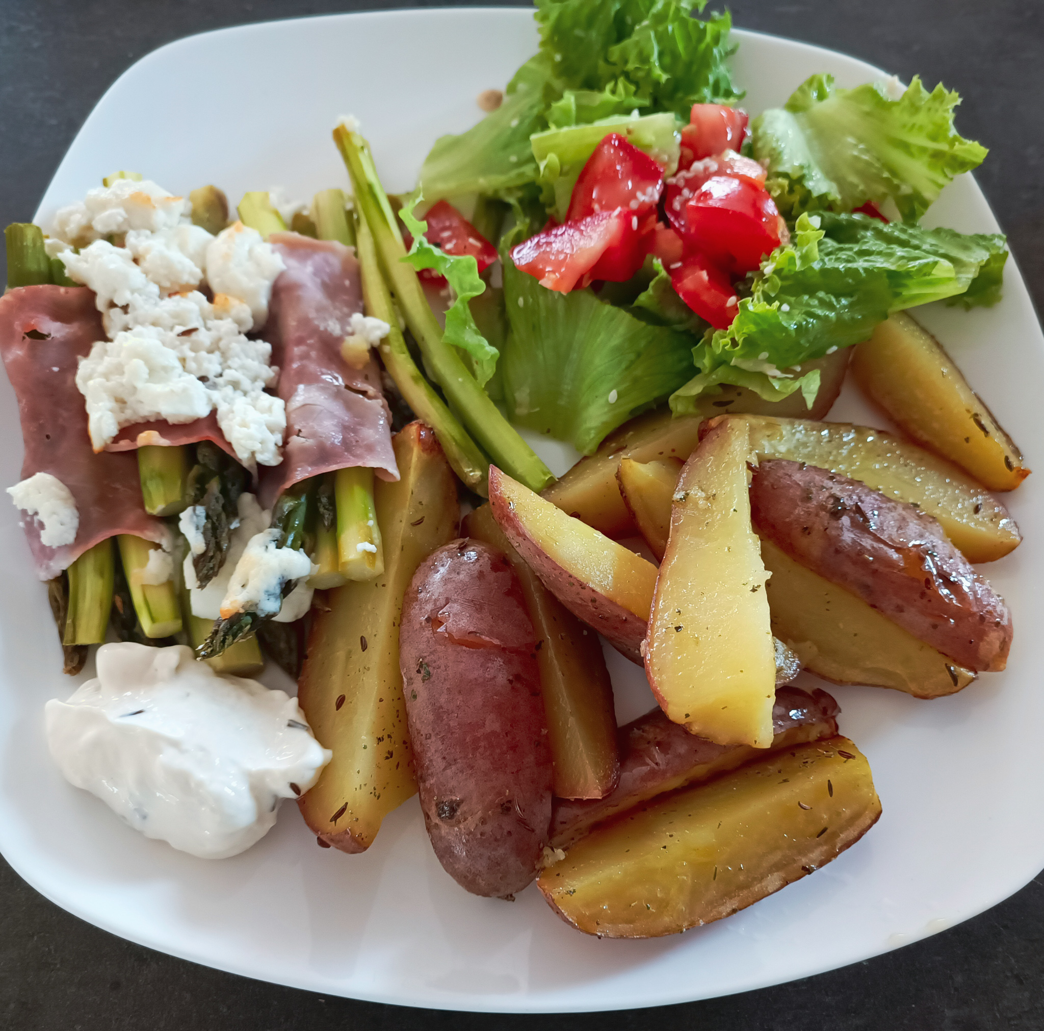 5. Chřest podáváme s majonézou. Já jsem k němu opekla růžové brambory ve slupce s rozmarýnem.