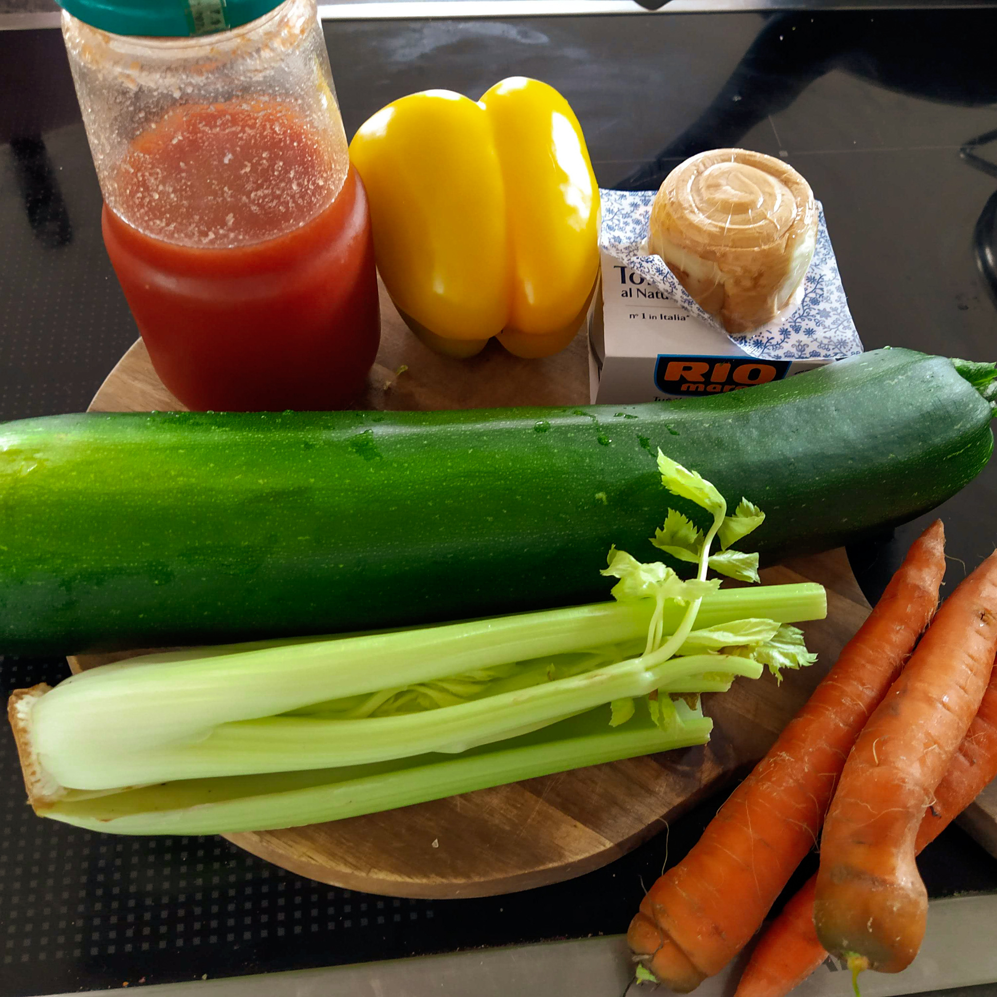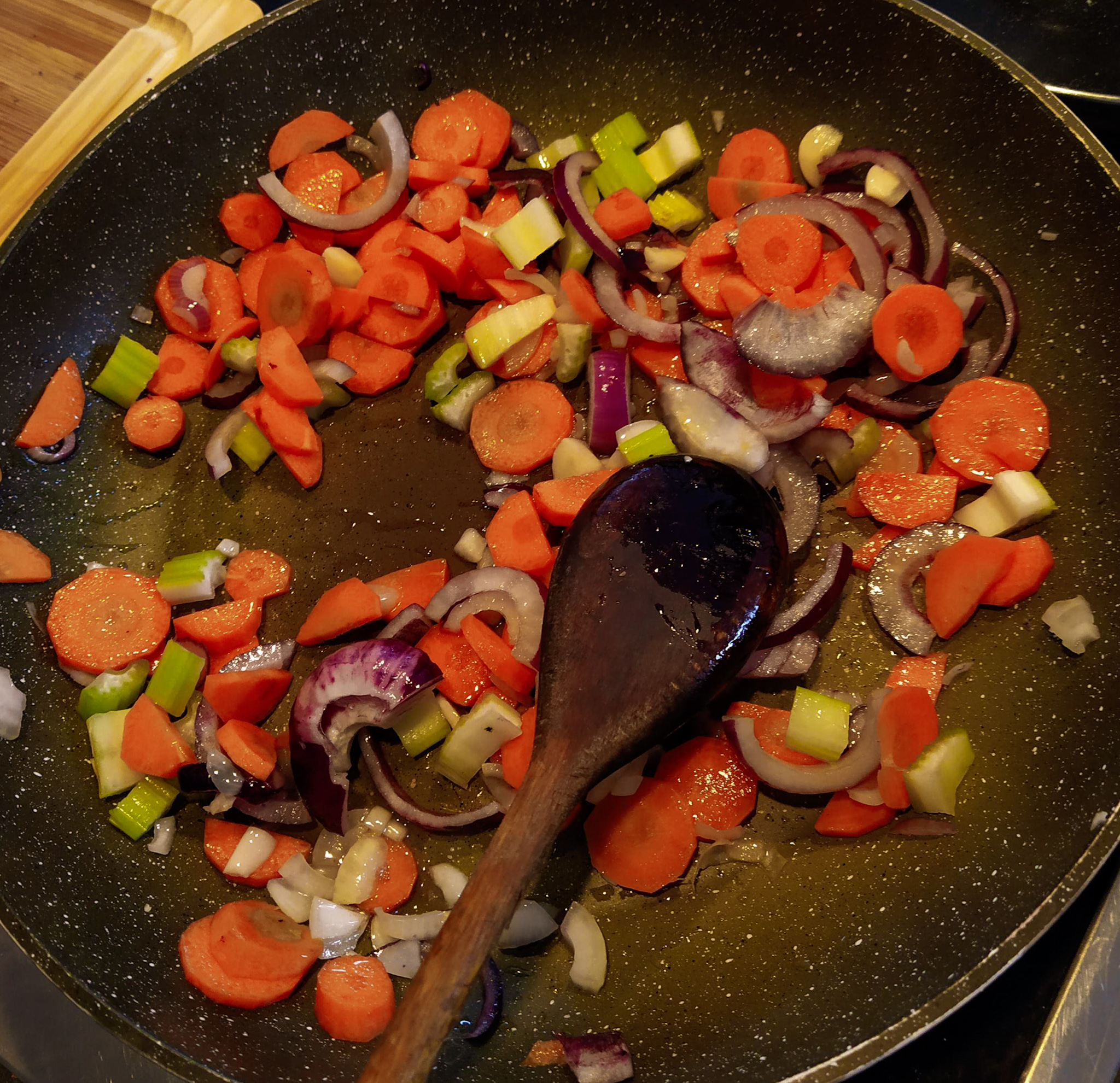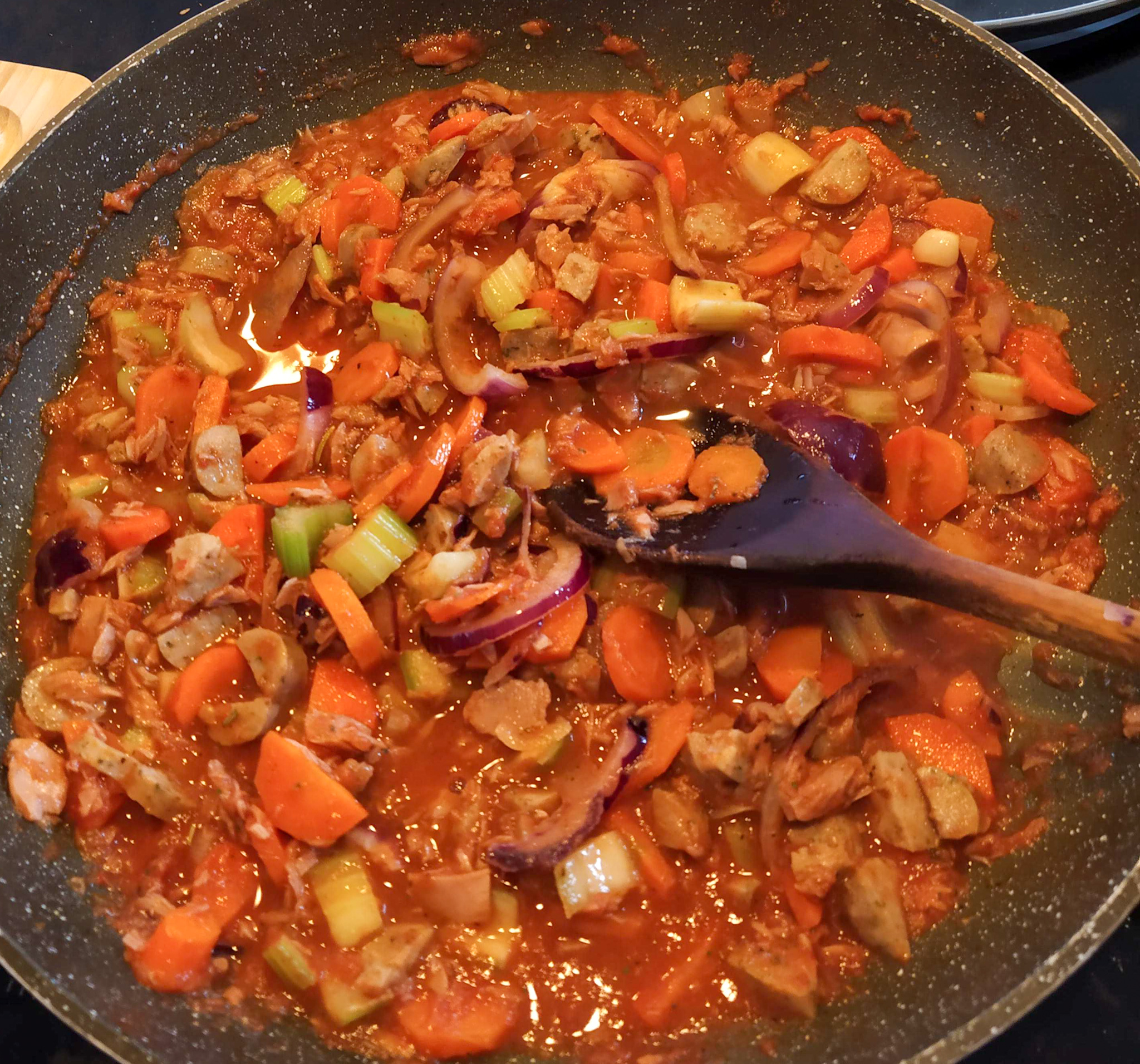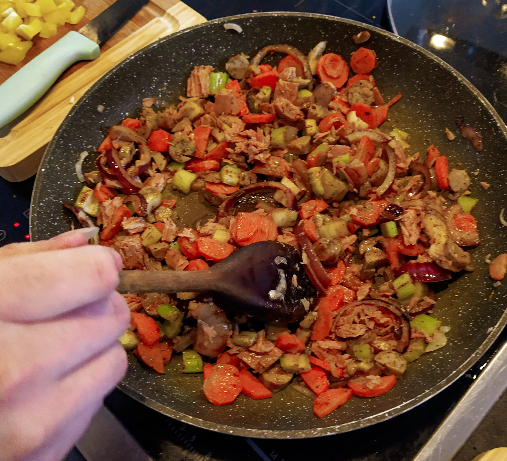 - Na pánvičce si necháme zesklovatět na oleji cibuli, česnek a mrkev. Přidáme na kostičky nasekaný řapíkatý celer, koření a bylinky. Po minutě míchání přidáme tuňáka, domácí kečup a papriku.