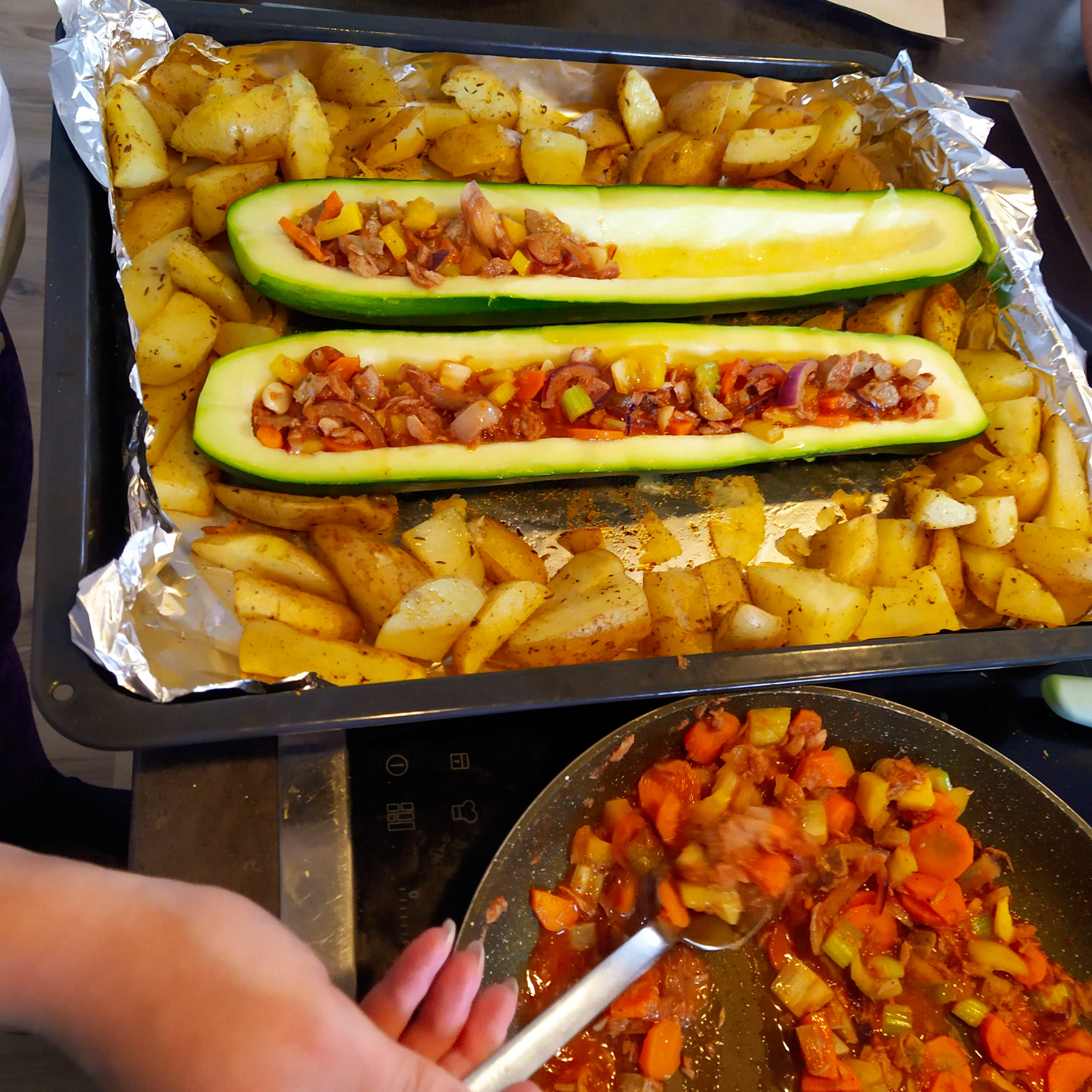 - Vaříme 5 minut a pak lžící přeložíme do vydlabané cukety. Cuketu zasypeme nastrouhaným sýrem. Pečeme 40 minut.