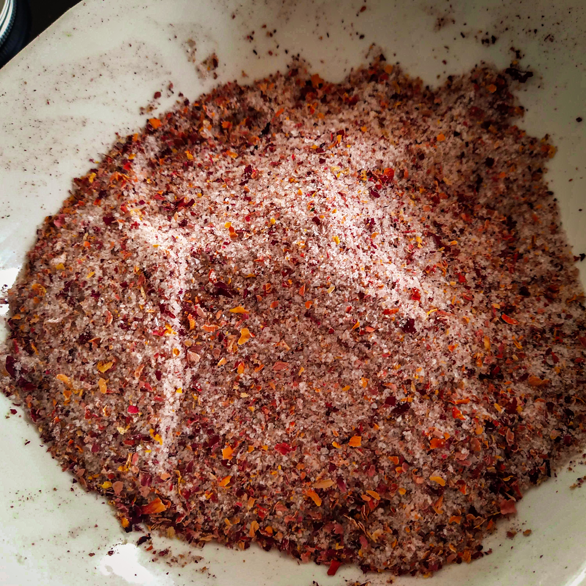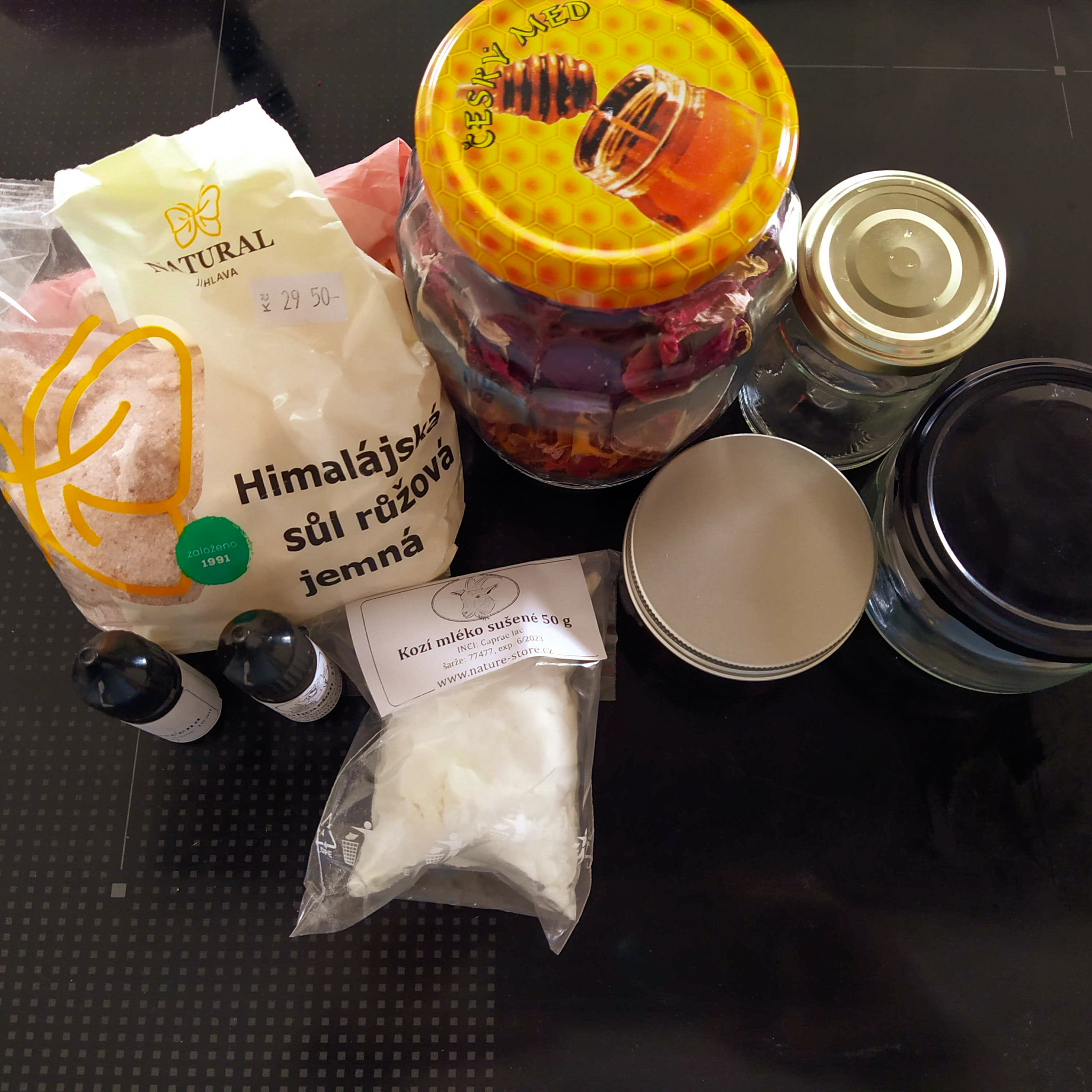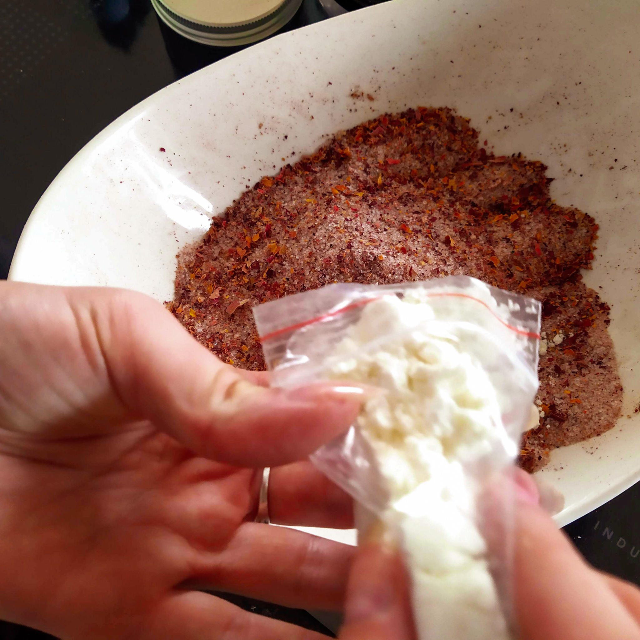 - Pomleté růže vsypeme do velké misky na promíchání. Přisypeme sůl a pak sušené kozí mléko. Rukou důkladně promícháme.