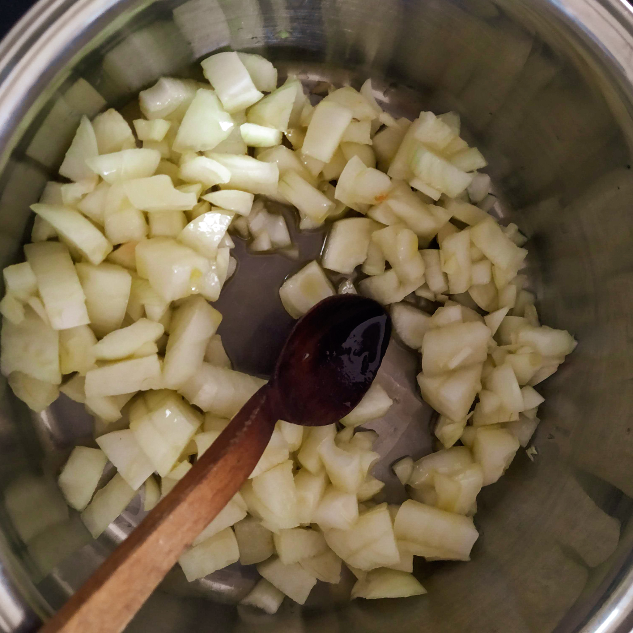 2. Na oleji orestujte kostičky cibule dozlatova, přidejte koření a restujte další 2 minuty.