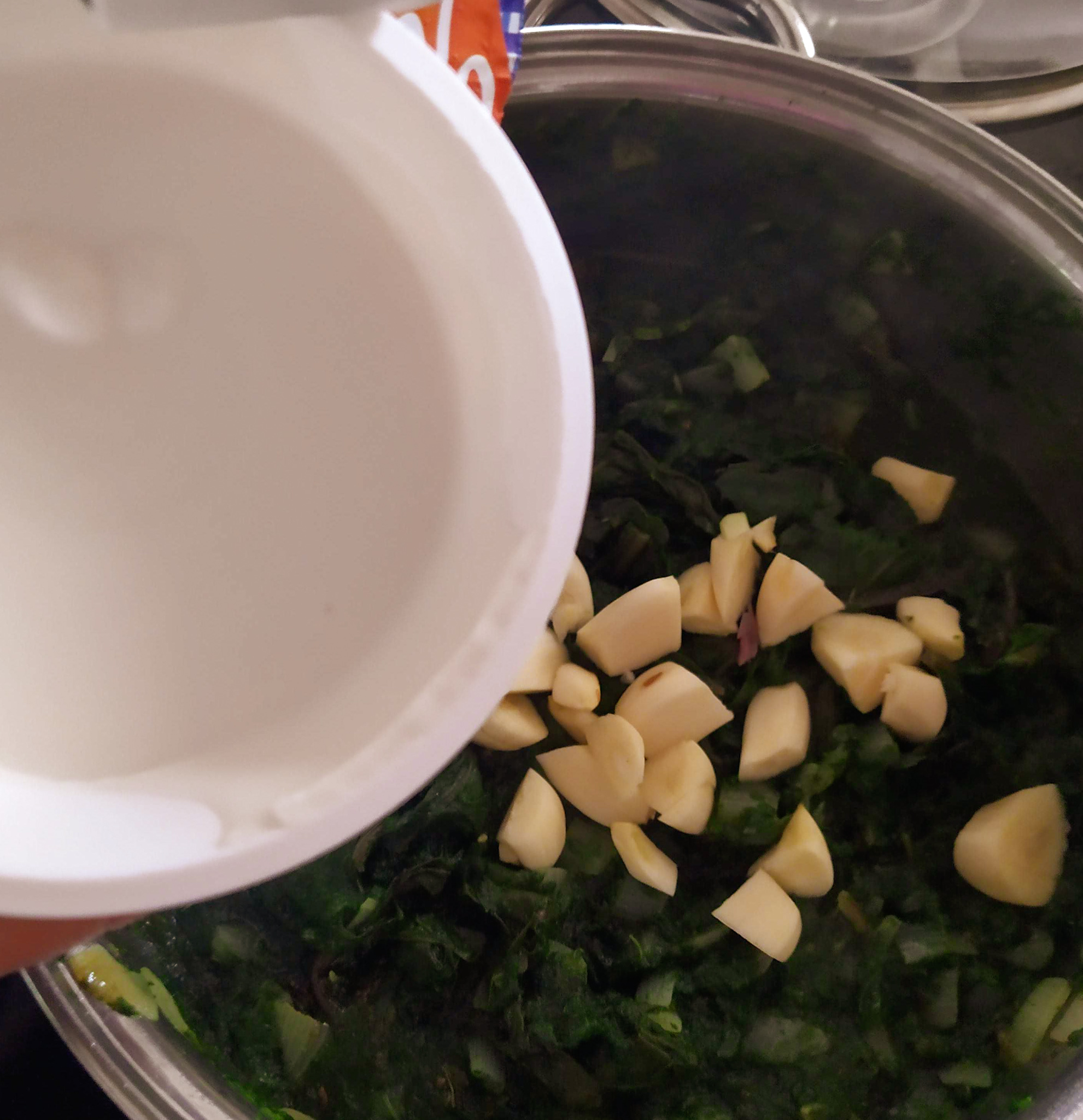 3. Následně přidejte omytý, na velké kousky nasekaný mangold a lehce osmahněte.