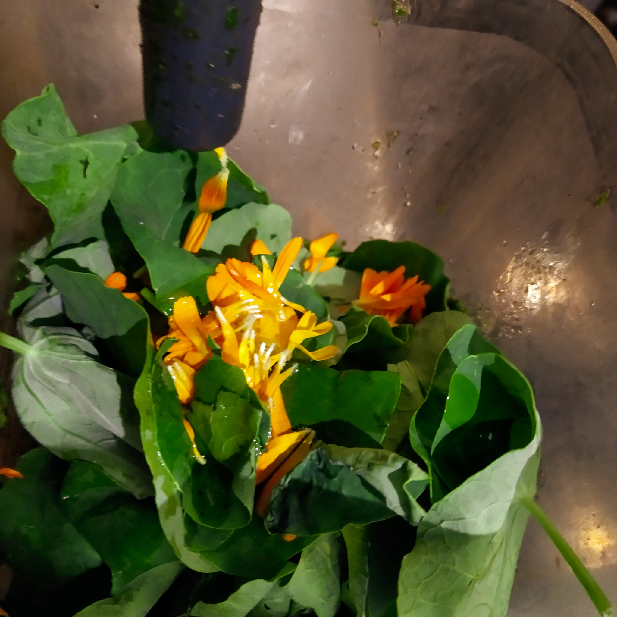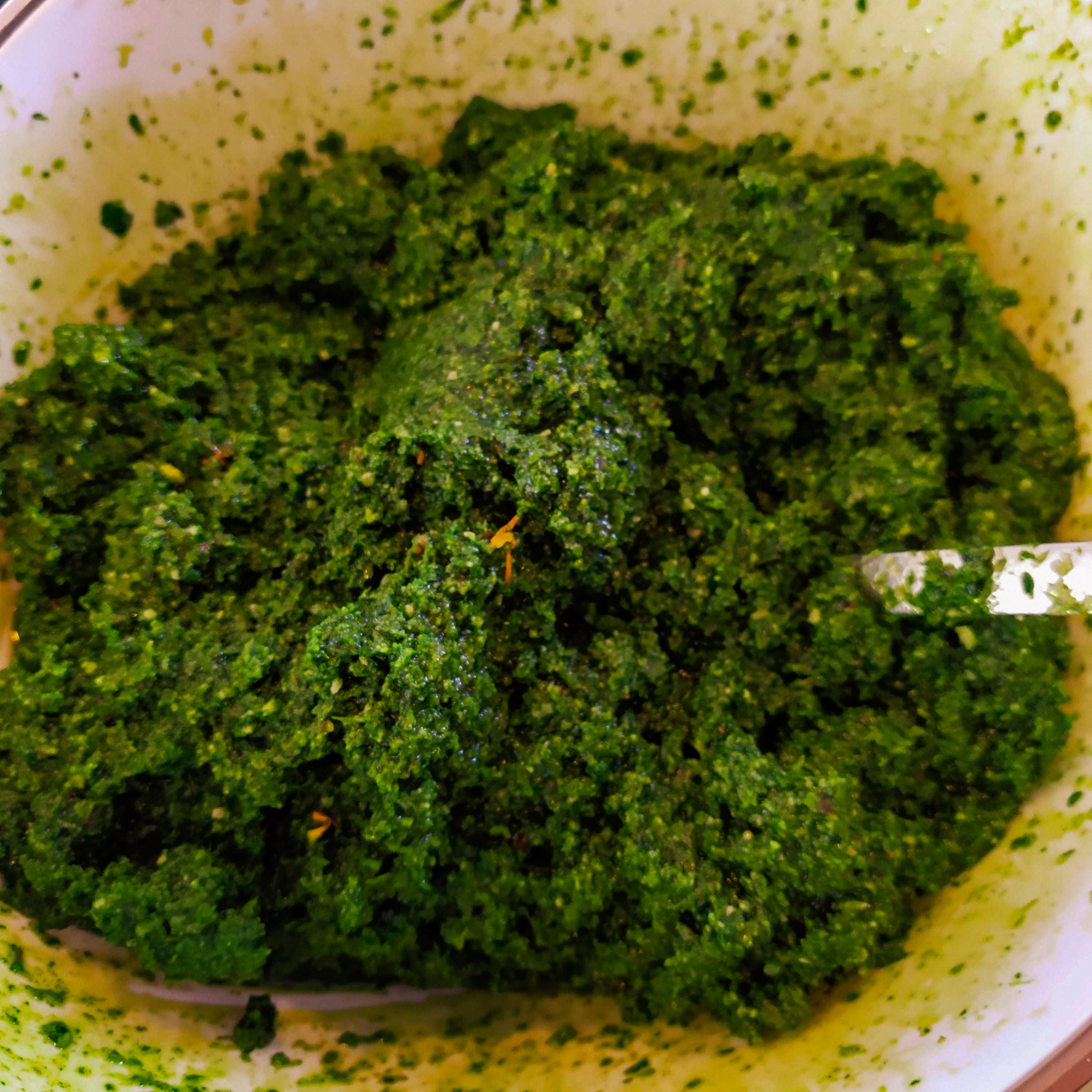 1.Listy dejte do sítka a pod tekoucí vodou je důkladně umyjte a nechte osušit, například na utěrce. Suché listy vložte do vysoké nádoby, ve které je ručním mixérem rozmixujte. Pokud máte klasický mixér, listy vložte do něj. Mně lépe fungoval ruční mixér. Celkové mixování bylo mnohem rychlejší, než když jsem se pokoušela listy přidávat do klasického mixéru po malých dávkách.