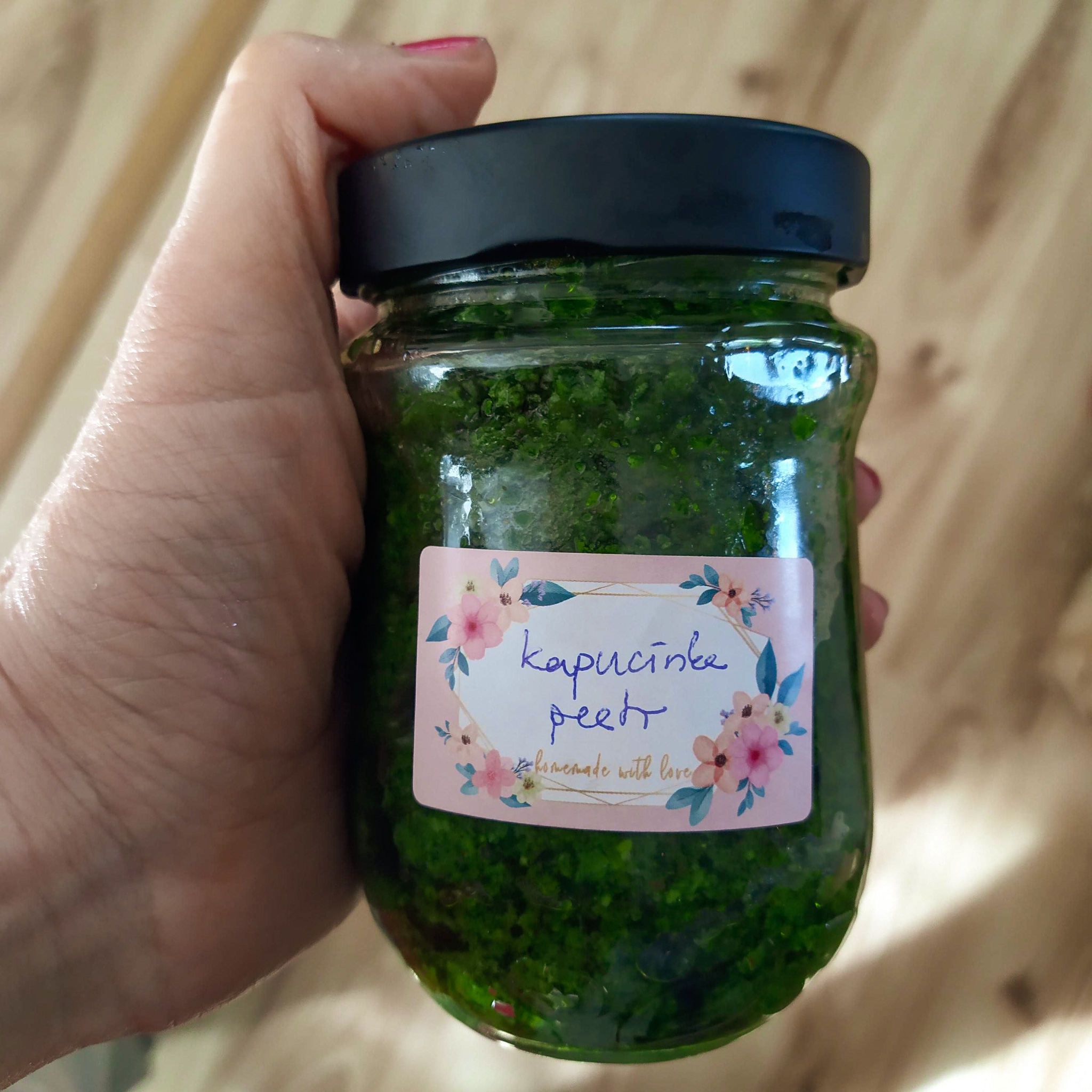 Pokud máte kapucínky celou tašku jako já, je to zhruba 600 g. Celkové množství pouze vynásobte dvěma. Z celé tašky vyrobíte přibližně 8–10 sklenic pesta. Můžete se tak podělit s rodinou a kamarády.