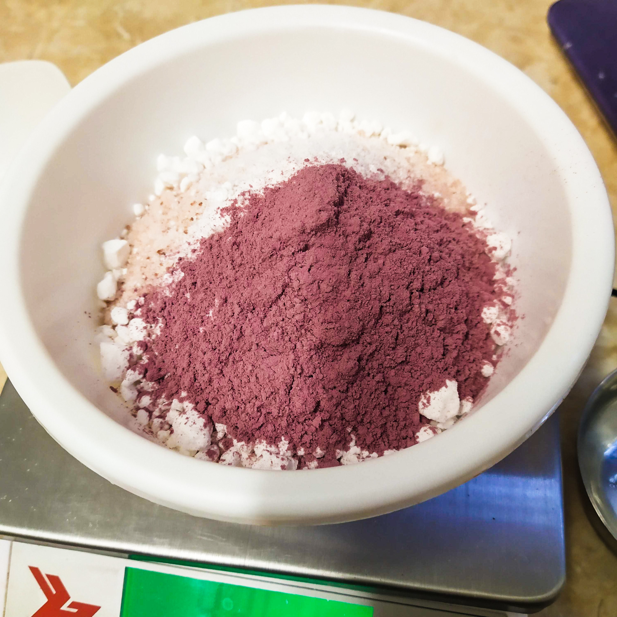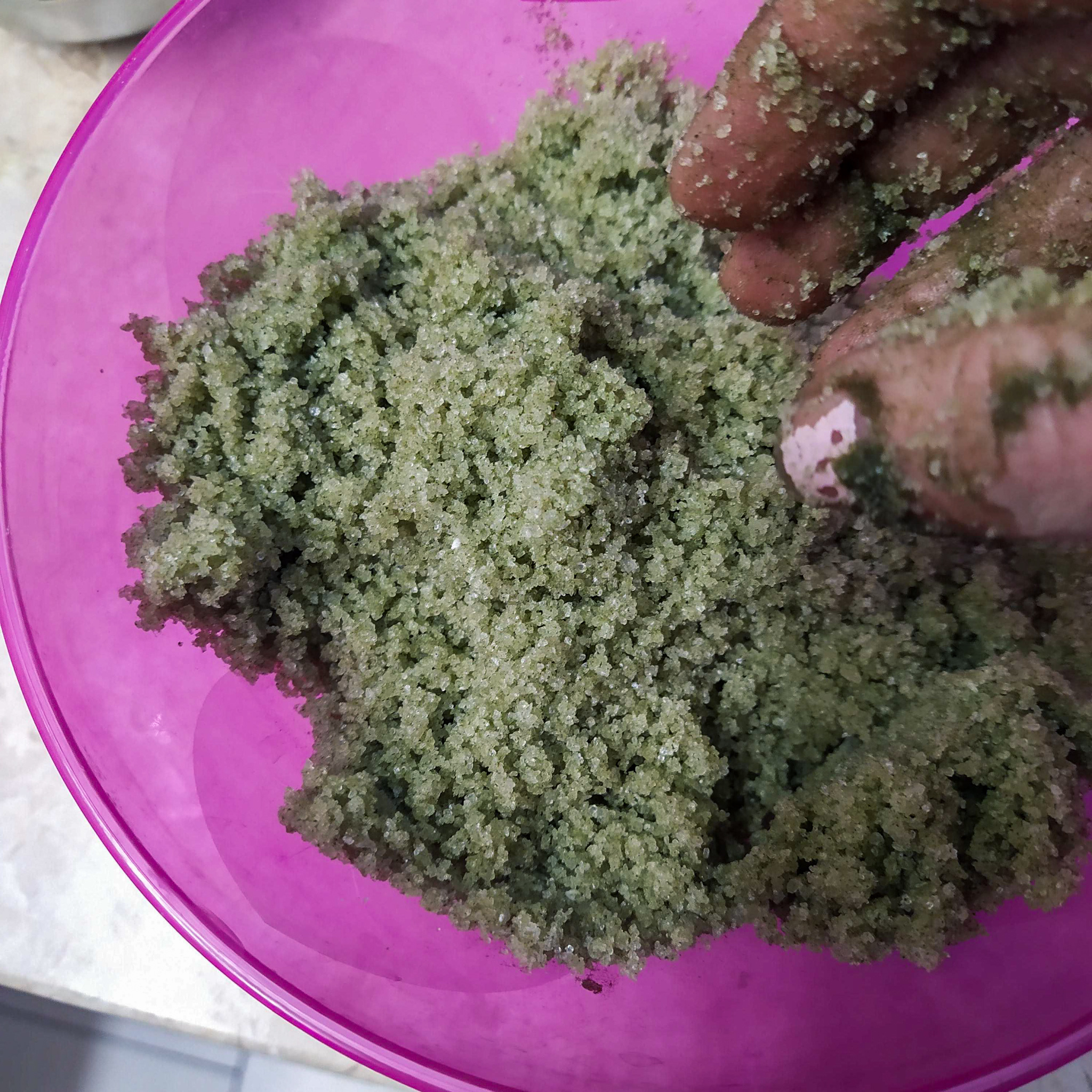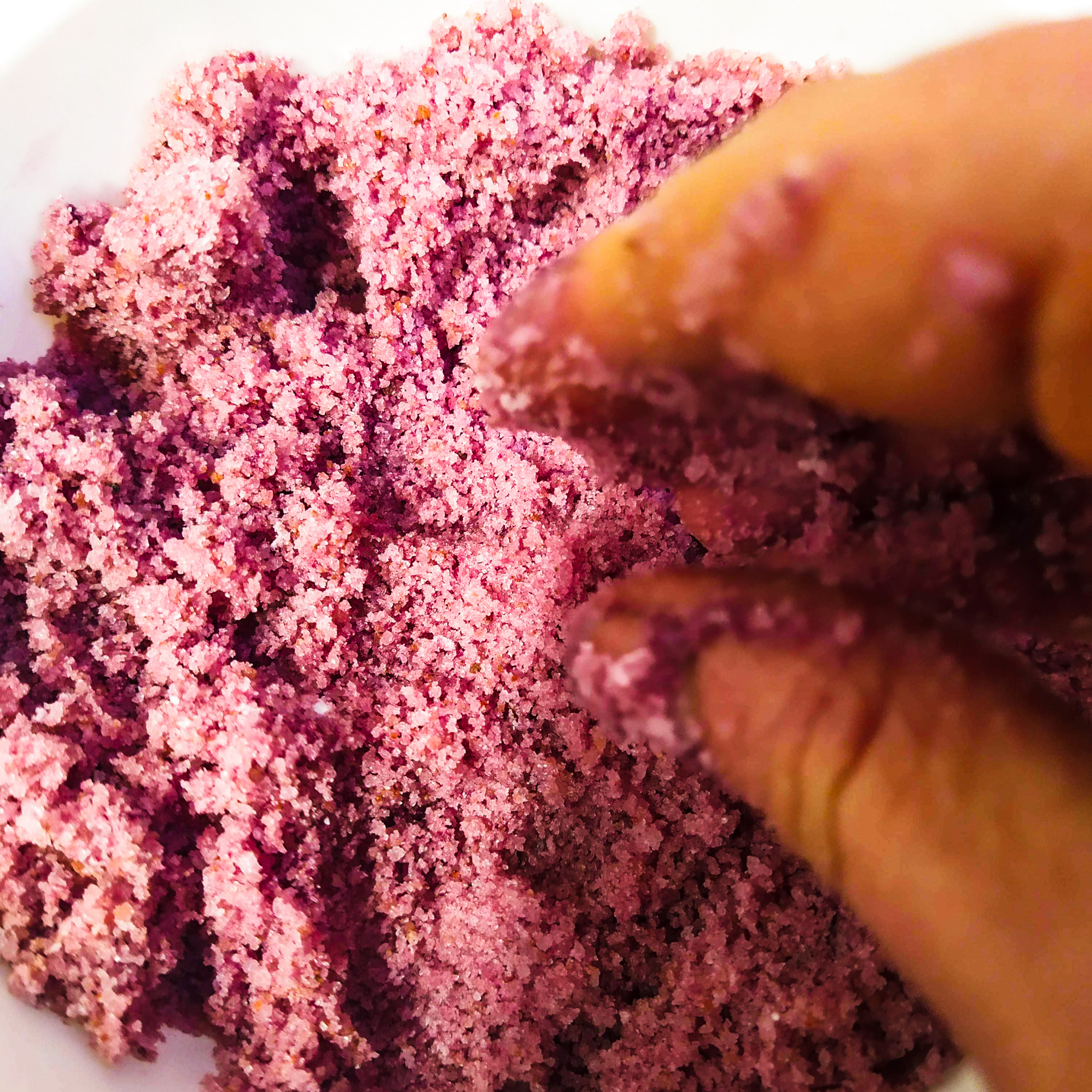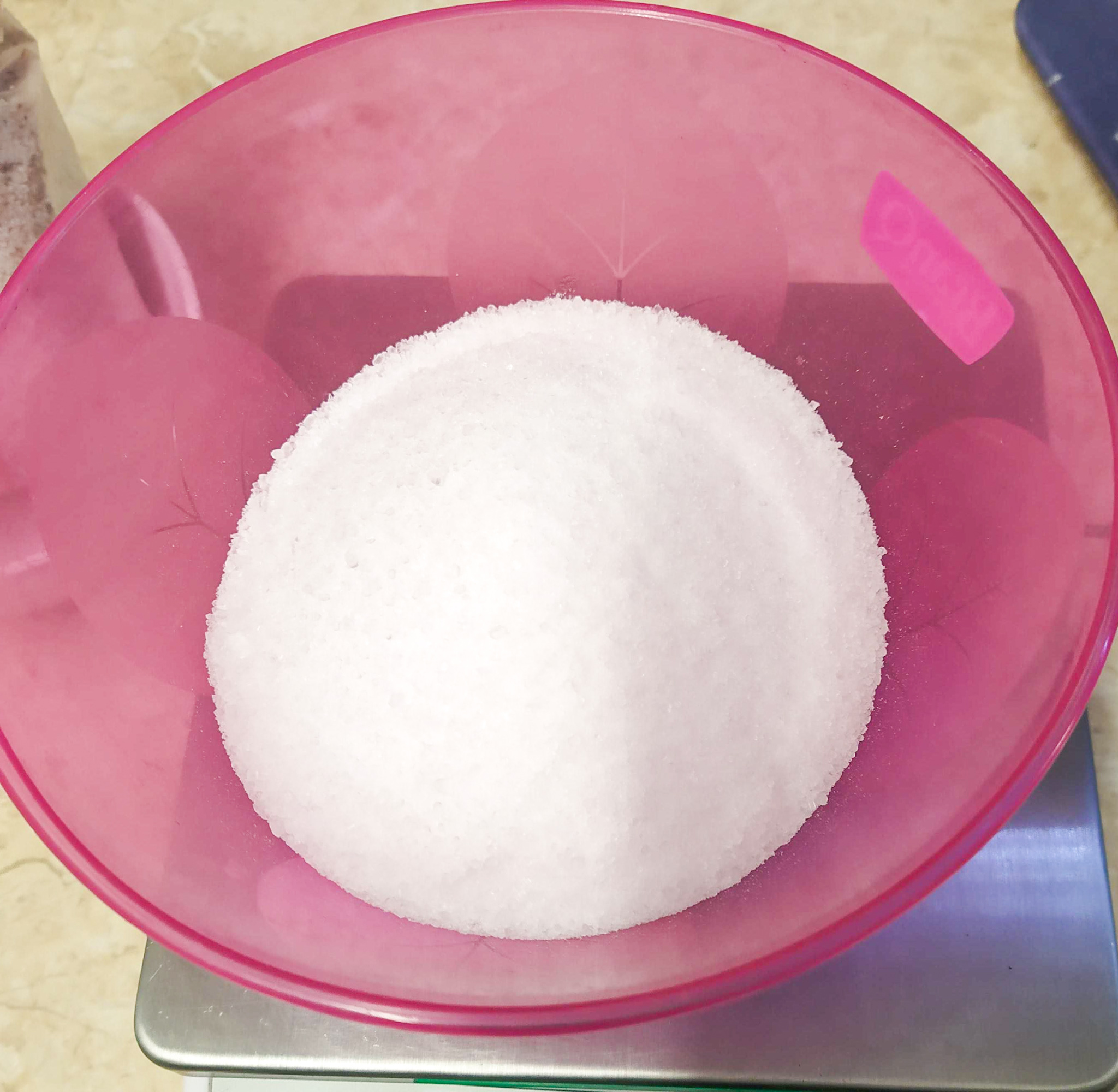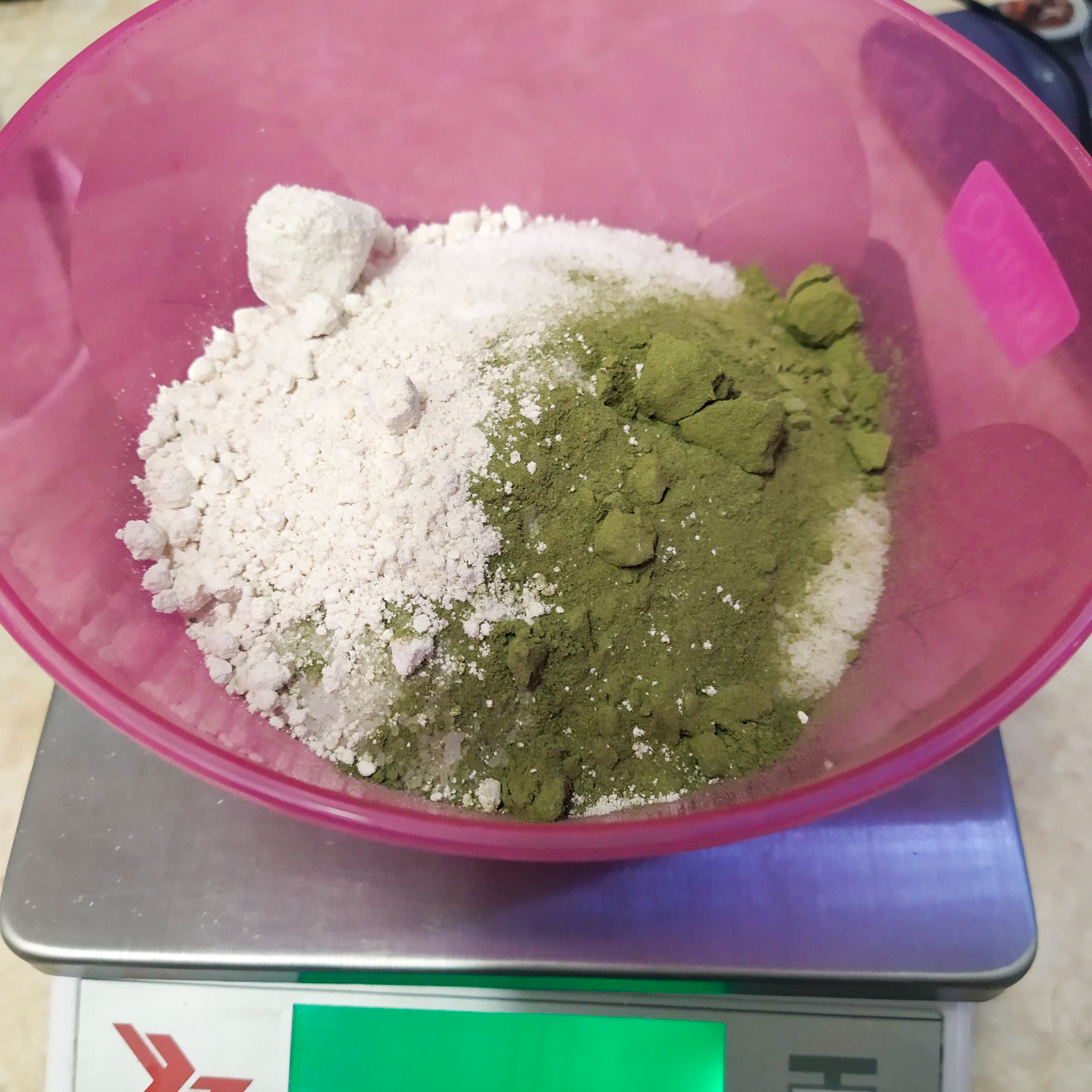 - Na váze si odvažte sůl a přidejte sypké složky: pudry, oves, epsomskou sůl nebo sušené kokosové mléko.