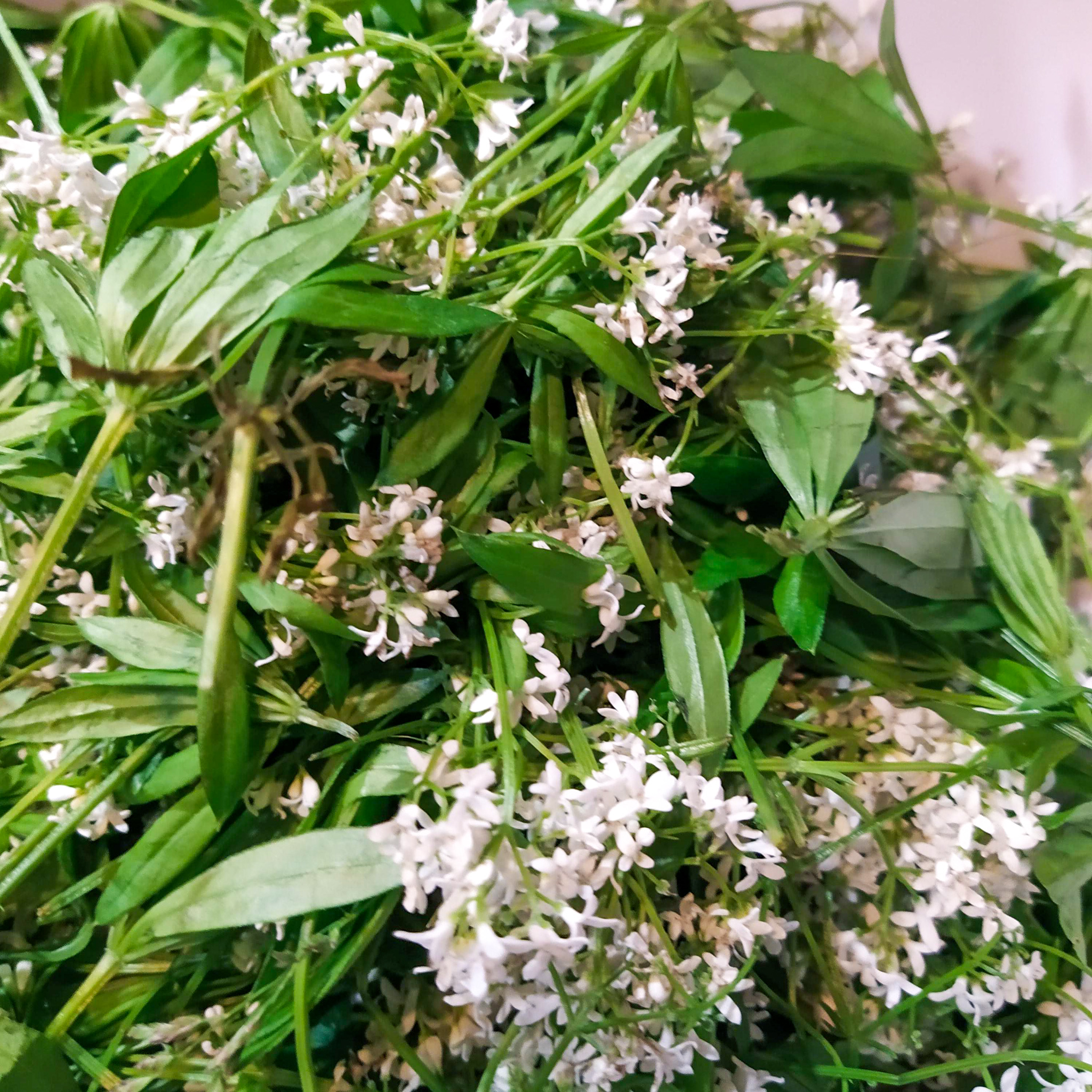 6–8 velkých hrstí čerstvé mářinky vonné – květ i stonek (střihám z rostlinky tak 10 cm)