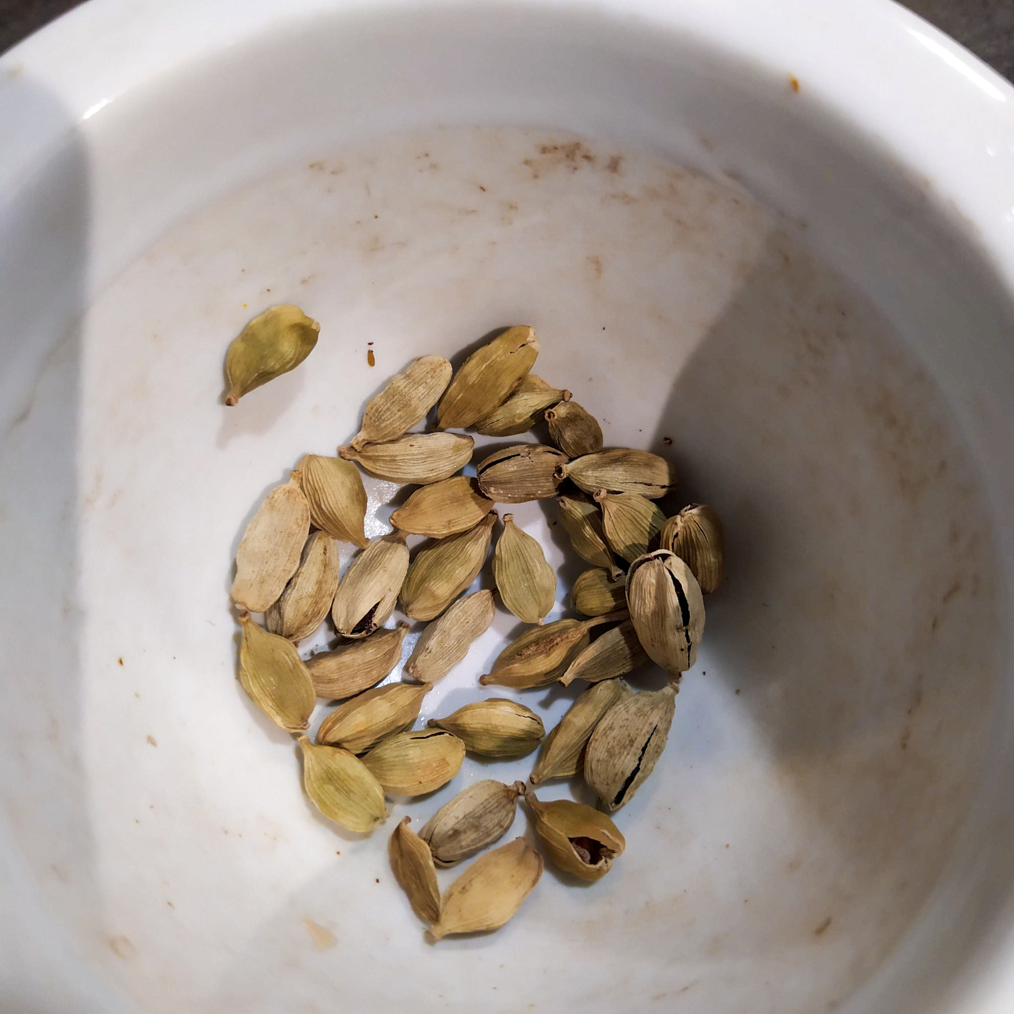 10 tobolek kardamomu roztlučených v hmoždíři