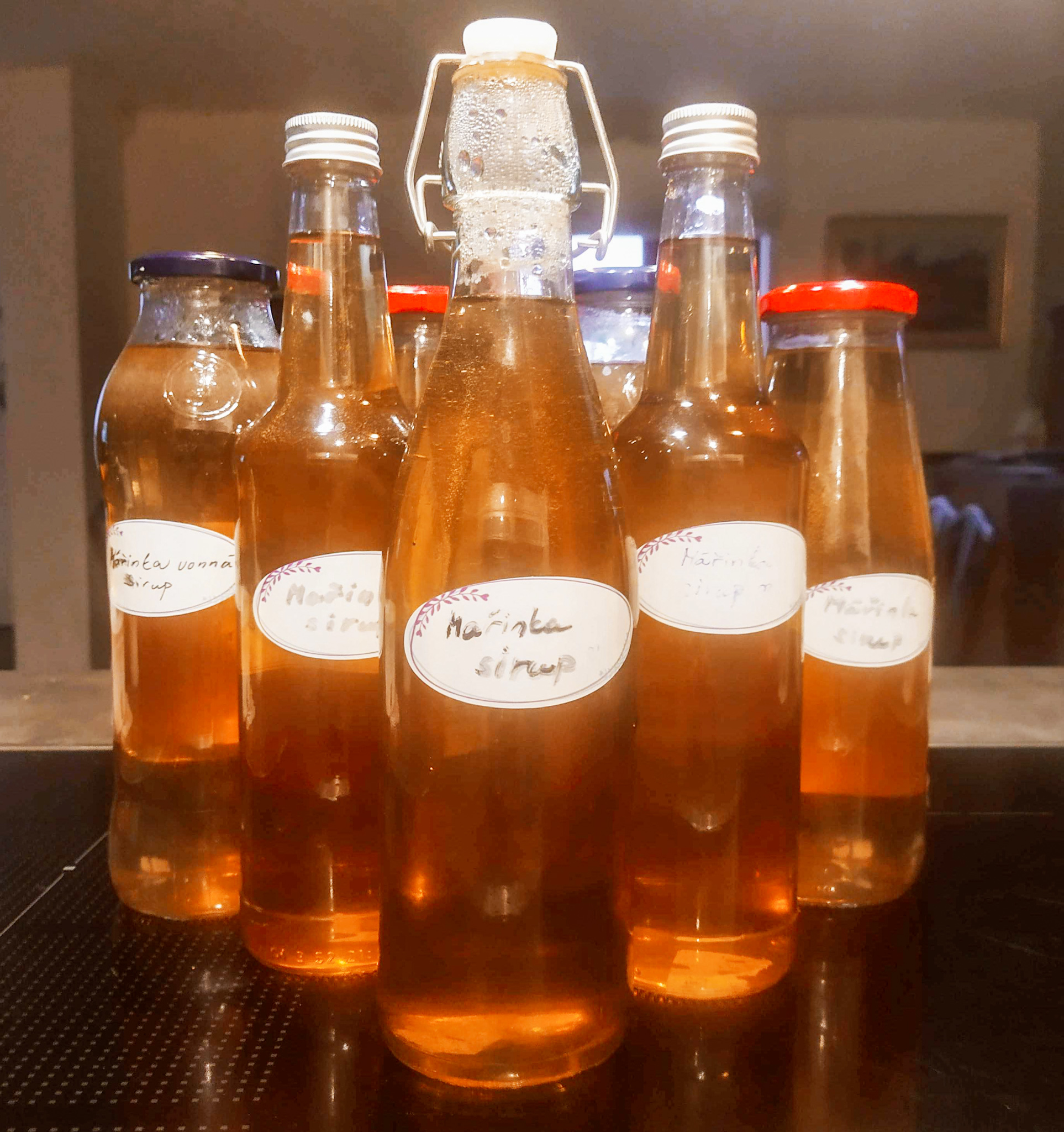 - Přelijte horké do vysterilizovaných lahví a po ochlazení označte. Po otevření sirup uložte do lednice.