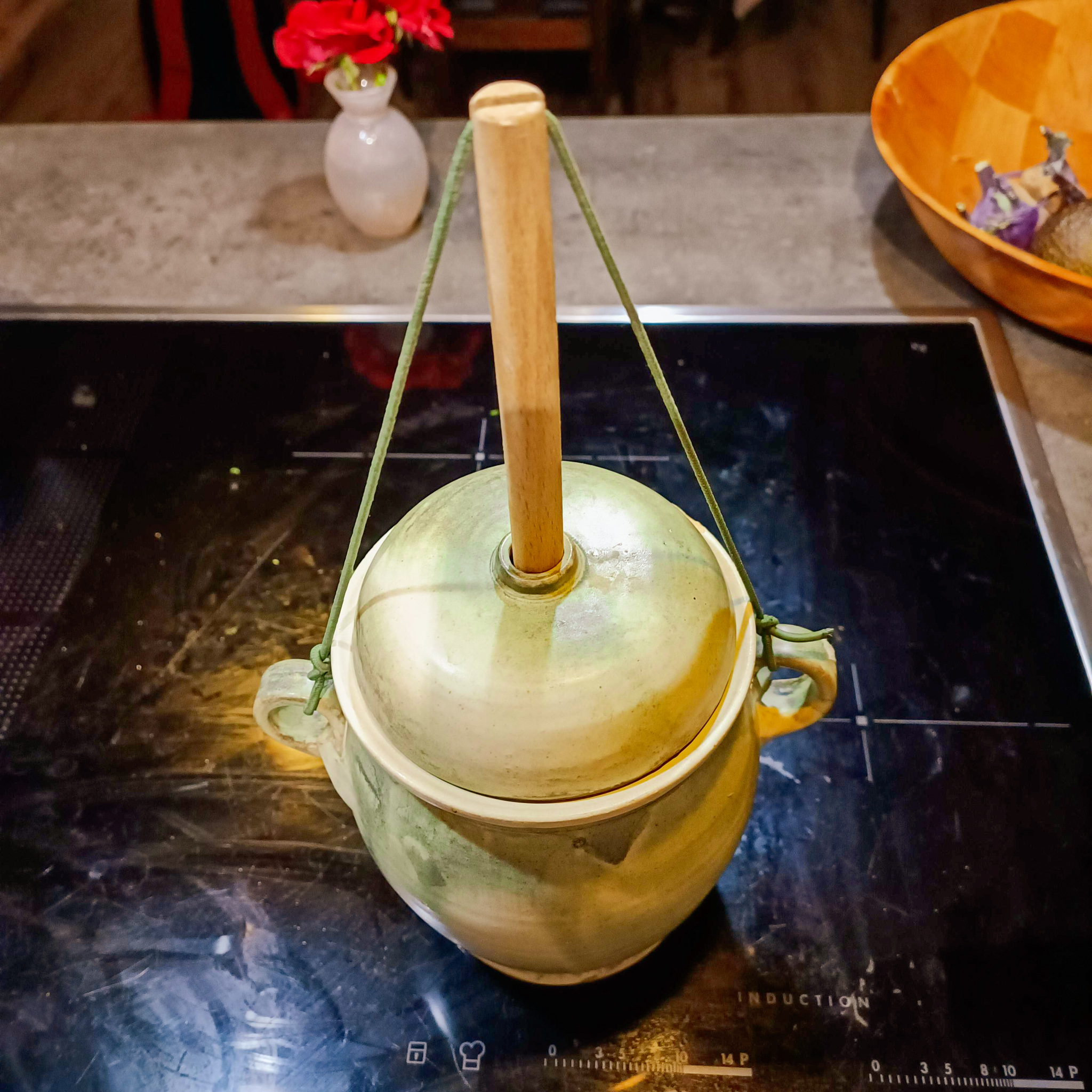 6. Poskládejte kvašáček dle návodu a typu, který máte. V Japonsku fermentovanou zeleninu zatěžují umytým říčným kamenem, aby vytlačili všechen vzduch a zelenina zůstala ponořená pod vodou. V mém keramickém kvašáčku je část, kterou dáte na zeleninu, a dřevěný píst s gumičkou vše stlačí dolů.